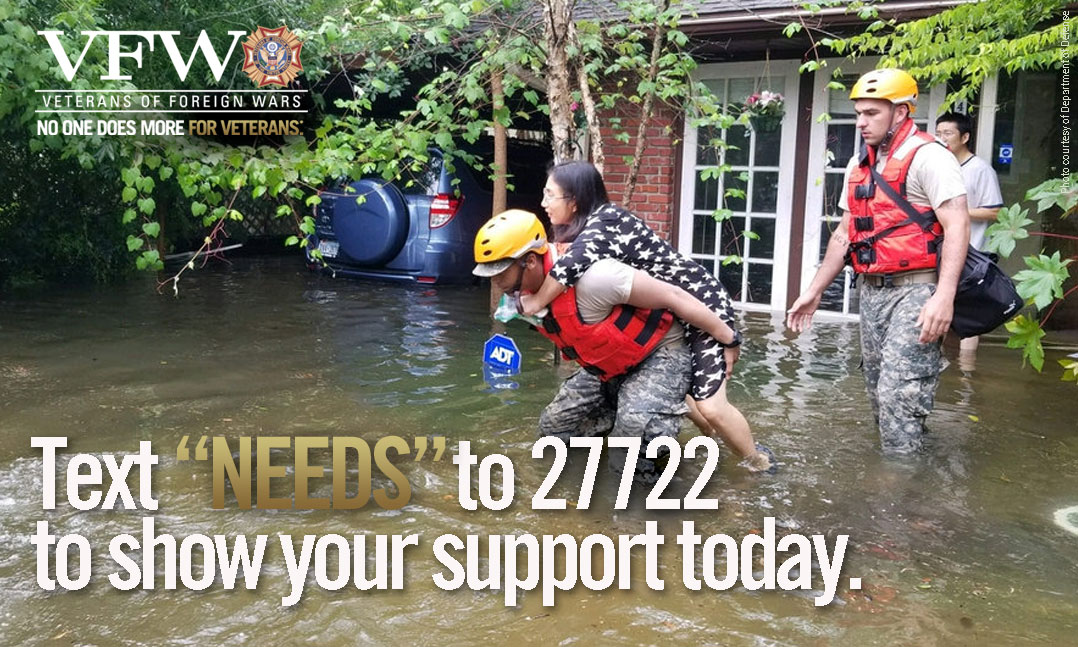 8/28/2017 - KANSAS CITY, Mo. – As the devastation in the wake of Hurricane Harvey continues in Texas and Louisiana, the Veterans of Foreign Wars of the U.S. stands ready to help affected service members, veterans and their families. While the full extent of Hurricane Harvey’s level of destruction is still being evaluated, the VFW knows from its past support of Hurricanes Sandy and Katrina victims that the need for financial assistance will be great. The VFW is calling on you to help...